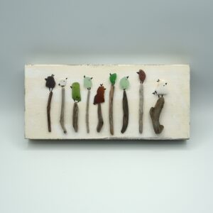 Sometimes, the glass tells a story before it’s even touched. In this series, shards of frosted green, white, and brown take center stage to mimic the life found along the coast. These are snapshots of the shoreline brought indoors.